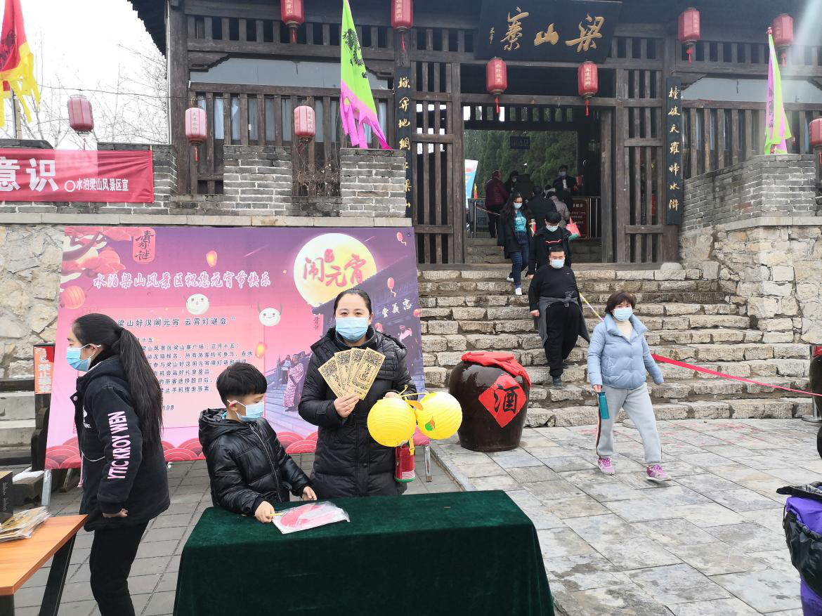 節(jié)日當(dāng)天,水泊梁山風(fēng)景區(qū)在線上、線下同時(shí)推出“猜燈謎,搶禮品”活動(dòng)。直播間內(nèi),網(wǎng)友們積極參與,與主播互動(dòng),將人氣推向高潮。梁山寨廣場(chǎng)兩側(cè)懸掛大紅燈籠,張貼謎語,各種燈謎,品類眾多,主要以好漢人物常識(shí)和水滸知識(shí)為主?;顒?dòng)通過大眾喜聞樂見的方式,傳遞普及水滸文化,受到廣大游客的一致好評(píng),也展現(xiàn)出別樣的水滸魅力。